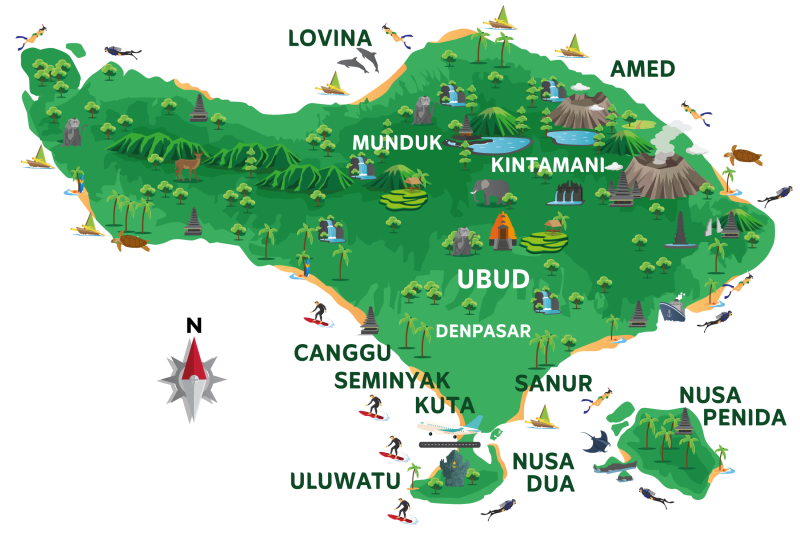 Bali è un'isola con una superfice di 5,590.15 km2 (due volte il canton Ticino o come la Liguria) ma con strade più sconnesse ed in alcune zone con un traffico non indifferente. Sapere dove andare, quanto tempo permanervi e come organizzare gli spostamenti diventa fondamentale per evitare stress e per approfittare al meglio del proprio tempo.
